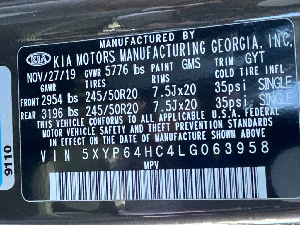 KIA Certified Eligible Certified, 3.648 Axle Ratio, 3rd row seats: split-bench, 4-Wheel Disc Brakes, 6 Speakers, ABS brakes, Air Conditioning, Alloy wheels, AM/FM radio: SiriusXM, Apple CarPlay & Android Auto, Brake assist, Bumpers: body-color, Carpeted Floor Mats, Delay-off headlights, Driver door bin, Driver vanity mirror, Dual front impact airbags, Dual front side impact airbags, Electronic Stability Control, Emergency communication system: 911 Connect, Four wheel independent suspension, Front anti-roll bar, Front Bucket Seats, Front Center Armrest, Front reading lights, Fully automatic headlights, Heated door mirrors, Heated Front Bucket Seats, Heated front seats, Hybrid Cargo Net, Illuminated entry, Knee airbag, Leather Shift Knob, Leather steering wheel, Low tire pressure warning, Occupant sensing airbag, Outside temperature display, Overhead airbag, Overhead console, Panic alarm, Passenger door bin, Passenger vanity mirror, Power door mirrors, Power driver seat, Power moonroof, Power steering, Power windows, Radio data system, Radio: AM/FM/MP3/SiriusXM Audio System, Rear air conditioning, Rear anti-roll bar, Rear reading lights, Rear window defroster, Rear window wiper, Reclining 3rd row seat, Remote keyless entry, Roof rack: rails only, Security system, SOFINO Artificial Leather Upholstery, Speed control, Speed-sensing steering, Split folding rear seat, Spoiler, Steering wheel mounted audio controls, Tachometer, Telescoping steering wheel, Tilt steering wheel, Traction control, Trip computer, Turn signal indicator mirrors, Variably intermittent wipers, Wheels: 7.5 x 20 Machined Finish Alloy.