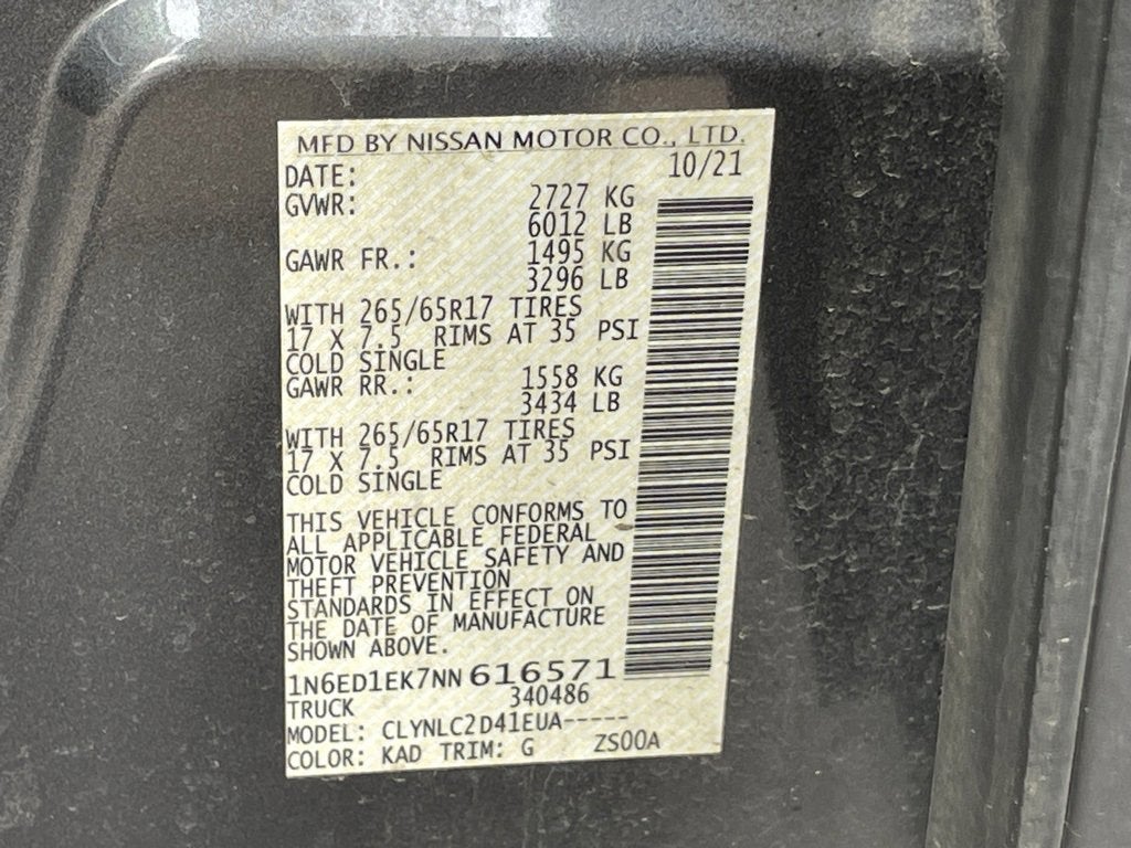 100 Hour Love It or Leave It Exchange Policy, 100 Year or 100,000 Mile Power-Train Warranty, Heated Seats, Cruise Control, Steering Wheel Controls, Keyless Entry, Bluetooth®, USB / AUV Ports, MP3 Player, SiriusXM Satellite Radio, Wireless Apple CarPlay, Wireless Google Android Auto, Alloy Wheels, Premium Wheels, Parking Sensors, Blind Spot Warning System, Rear Cross Traffic Alert and Braking, Lane Keep Assist, Forward Collision Alert, Premium Audio, Color Touchscreen Display, Backup / Rear View Camera, Spray-In Bed Liner, Frontier SV, 4D Crew Cab, 3.8L DI DOHC 24V V6, 9-Speed Automatic, 4WD, Gun Metallic, Charcoal w/Cloth Seat Trim, 120V Power Outlet in Bed, 120V Power Outlet in Rear Center Console, 17 Alloy Wheels, 3.692 Axle Ratio, 4-Wheel Disc Brakes, 6 Speakers, ABS brakes, Air Conditioning, Alloy wheels, AM/FM radio: SiriusXM, Anti-whiplash front head restraints, Apple CarPlay/Android Auto, Auto High-beam Headlights, Bed Under-Rail Lighting, Blind Spot Warning, Brake assist, Bumpers: body-color, Delay-off headlights, Driver door bin, Driver vanity mirror, Dual front impact airbags, Dual front side impact airbags, Electronic Stability Control, Floor Mats, Front anti-roll bar, Front Bucket Seats, Front Center Armrest, Front Halogen Fog Lights, Front reading lights, Front wheel independent suspension, Fully automatic headlights, Halogen Daytime Running Lights, Heated Front Seats, Heated Leather Steering Wheel, Heated Outside Mirrors, High Beam Assist (HBA), HVAC - Dual-Zone Front Auto A/C, I-Key w/Request Switches on O/S Handles, Illuminated entry, Intelligent Cruise Control, Knee airbag, Lane Departure Warning System, Leather Shift Lever, Low tire pressure warning, Occupant sensing airbag, Overhead airbag, Overhead Console Storage (Sunglass Holder), Panic alarm, Passenger door bin, Passenger vanity mirror, Power door mirrors, Power driver seat, Power steering, Power windows, Premium Cloth Seat Trim, Radio data system, Radio: SXM/AM/FM/AUX/USB Audio System w/6 Speakers, Rear anti-roll bar, Rear Automatic Braking (RAB), Rear Cross Traffic Alert (RCTA), Rear seat center armrest, Rear Sonar System, Rear step bumper, Remote Engine Starter, Remote keyless entry, Security system, Sliding Rear Window, Speed control, Speed-sensing steering, Split folding rear seat, Spray-In Bedliner, Steering wheel mounted audio controls, SV Comfort & Convenience Package, Tachometer, Technology Package, Tilt steering wheel, Traction control, Trailer Hitch w/Wiring Harness, Trip computer, Utili-Track System, Variably intermittent wipers, Voltmeter.