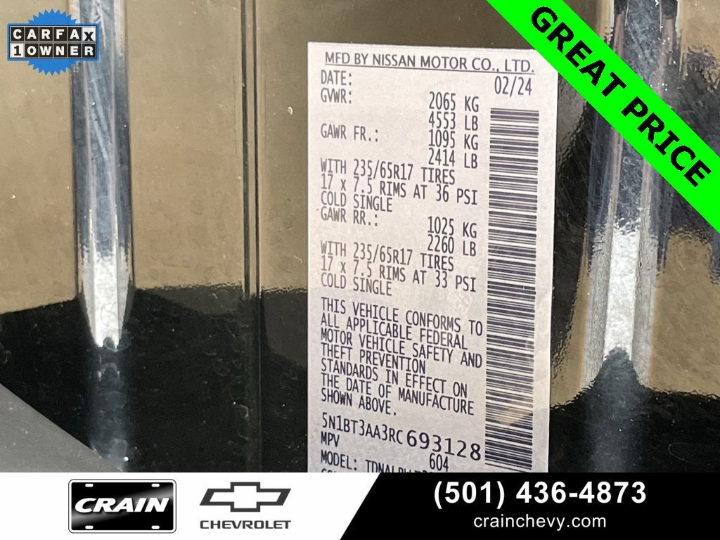 100 Hour Love It or Leave It Exchange Policy, 100 Year or 100,000 Mile Power-Train Warranty, *** 1 Owner CARFAX ***, Cruise Control, Steering Wheel Controls, Keyless Entry, Bluetooth®, USB / AUV Ports, MP3 Player, SiriusXM Satellite Radio, Wireless Apple CarPlay, Wireless Google Android Auto, Alloy Wheels, Premium Wheels, Blind Spot Warning System, Rear Cross Traffic Alert and Braking, Lane Keep Assist, Forward Collision Alert, Premium Audio, Color Touchscreen Display, Backup / Rear View Camera, Rogue S, 4D Sport Utility, 1.5L DOHC, CVT with Xtronic, FWD, Super Black, Charcoal w/Cloth Seat Trim, 17 Aluminum Alloy Wheels, 4 Speakers, 4-Wheel Disc Brakes, 5.676 Axle Ratio, ABS brakes, Air Conditioning, Alloy wheels, AM/FM radio: SiriusXM, Auto High-beam Headlights, Blind Spot Warning, Brake assist, Bumpers: body-color, Cloth Seat Trim, Delay-off headlights, Driver door bin, Driver vanity mirror, Dual front impact airbags, Dual front side impact airbags, Electronic Stability Control, Four wheel independent suspension, Front anti-roll bar, Front Bucket Seats, Front Center Armrest, Front reading lights, Fully automatic headlights, Illuminated entry, Knee airbag, Low tire pressure warning, NissanConnect featuring Apple CarPlay and Android Auto, Occupant sensing airbag, Outside temperature display, Overhead airbag, Overhead console, Panic alarm, Passenger door bin, Passenger vanity mirror, Power door mirrors, Power steering, Power windows, Radio data system, Radio: AM/FM NissanConnect, Rear anti-roll bar, Rear Parking Sensors, Rear seat center armrest, Rear side impact airbag, Rear window defroster, Rear window wiper, Remote keyless entry, Speed control, Speed-Sensitive Wipers, Split folding rear seat, Spoiler, Steering wheel mounted audio controls, Tachometer, Telescoping steering wheel, Tilt steering wheel, Traction control, Trip computer, Variably intermittent wipers.